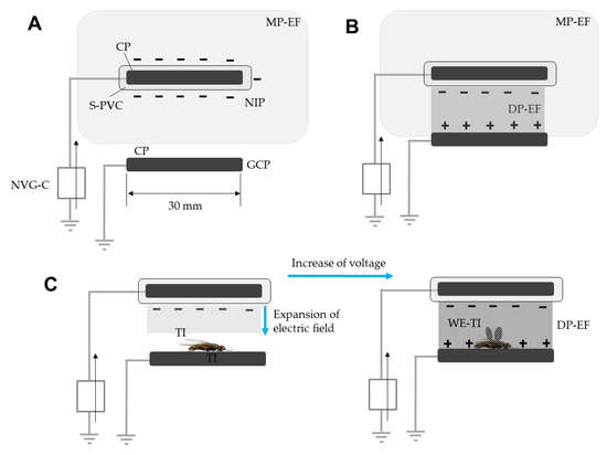 Structure of an experimental instrument for capturing insects and the formation of monopolar and dipolar electric fields. (A) Two identical conductor (iron) plates (CPs) were horizontally arranged; the upper plate was insulated with a soft polyvinyl chloride (S-PVC) resin and linked to a negative voltage generator (continuous-charge type) (NVG-C), and the lower plate was non-insulated and linked to a grounded line (cross-sectional view). A negatively charged insulated conductor plate (NIP) formed a monopolar electric field (MP-EF) in the surrounding space. A grounded conductor plate (GCP) was located outside the MP-EF. (B) When the GCP entered the MP-EF, it was positively polarized by the negative surface of the NIP as a result of electrostatic induction; eventually, a dipolar electric field (DP-EF) was formed between the two plates. (C) Determination of the expansion of the electric field based on a wing erectness phenomenon observed with a test insect (TI) that entered the dipolar electric field. The electric field was expanded in direct proportion to the increase in the voltage applied to the insulated conductor plate. The insect lifted its wings (WE-TI) when it entered the electric field. The black arrows represent the direction of the movement of negative electricity.