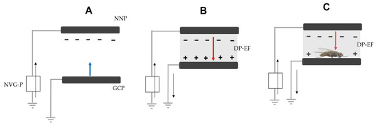 (A) Formation of an insect body bridge between the negatively charged insulated conductor plate (NIP), which was linked to a negative voltage generator (continuous-charge type) (NVG-C), and the grounded conductor plate (GCP). The electric current (red arrow) moved over a direct route (i.e., the insect body) between the two plates. (B) Formation of an insect-mediated opposite pole to the NIP. A large fly (housefly and greenbottle fly) on the GCP reached a monopolar electric field (MP-EF) to create a dipolar electric field (DP-EF) between the NIP and the fly. Eventually, the fly was positively electrified and drawn to the NIP (blue arrow). At this distance between the NIP and GCP, small insects did not reach the MP-EF and were therefore not drawn to the NIP. The solid black arrow represents the direction of movement of the negative charge (free electrons), and the dotted black arrow represents an insect-derived transient electric current caused by its positive electrification.