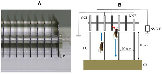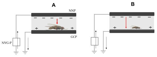 Figure 1 shows the structure of the instrument used to capture insects. The instrument consisted of two identical iron plates (30 × 20 mm2; thickness, 1 mm) horizontally arranged at defined separation intervals (5 or 10 mm). One plate was coated with a soft polyvinyl chloride resin for insulation (coating thickness, 2 mm; resistivity, 2 × 108 Ωcm) (Sonoda Seisakusho, Osaka, Japan) and linked to a direct current (DC) negative voltage generator (NVG) (continuous-charge type; applicable voltage, –0.1 to –10 kV) (Max Electronics, Tokyo, Japan). The voltage generator was operated by a lithium storage battery (12 V). The other plate was non-insulated and linked to a grounded line. In this instrument, the negative charge that accumulated on the surface of the charged conductor plate dielectrically polarized an insulating cover, positively on the inner surface and negatively on the outer surface [39]. The negative charge on the insulated conductor plate (ICP) generated a monopolar electric field in the surrounding space (Figure 1A). When the grounded conductor plate (GCP) entered the monopolar electric field, the negative charge on the ICP polarized it positively to form a dipolar electric field between them (Figure 1B). Any insect that entered the dipolar electric field was deprived of free electrons from its body, causing it to be positively polarized. This drew the polarized insect to the negatively charged ICP (NIP) [5].