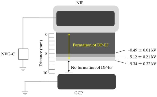 The voltages required to form a dipolar electric field (DP-EF) between a negatively charged insulated conductor (iron) plate (NIP) and a grounded conductor plate (GCP), which were spaced by different distances (5–10 mm). The NIP was linked to a negative voltage generator (continuous-charge type) (NVG-C) and charged with different voltages (–0.1 to –10 kV).