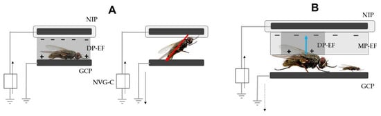To solve this problem, it was essential to make the separation distance wider. A separation interval of 10 mm was wide enough to avoid this problem. At this distance, the NIP was not able to expand its monopolar electric field to the GCP even when the highest voltage (–10 kV) was applied; the expansion at –10 kV was approximately 7 mm (Figure 6). However, large flies (houseflies and greenbottle flies) reached the monopolar electric field (MP-EF) and formed a dipolar electric field between the NIP and themselves when they were located on the GCP (Figure 7B). In this situation, the flies were deprived of free electrons and became positively polarized, eventually being drawn to the NIP (Table 2). In both fly species, male flies were smaller than females, and therefore lower voltages (–8 kV) were sufficient to capture them, while a charge of –9 kV was necessary to capture female adults. Video S3B shows the successful capture of a female adult housefly at –9 kV.