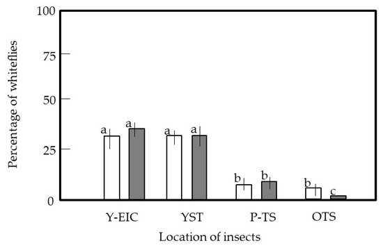 Assay of the preferential attraction of whiteflies to a yellow-colored electrostatic insect catcher (Y-EIC), a yellow sticky trap (YST), and a potted tomato seedling (P-TS), which were placed in concyclic positions at equal distances. A vessel containing test insects was placed at the central position of a circle. Adult whiteflies were used as test insects. In all experiments, the destinations of test insects were recorded 1 day (open) and 2 days (gray column) after their release. OTS represents other places, such as in the vial or on the floor, wall, and ceiling of the cabinet. Twenty insects were used in each experiment, and the means and standard deviations were calculated from five replicates of the experiments. The letters a–c in each vertical column indicate significant differences (p < 0.05) according to Tukey’s test.