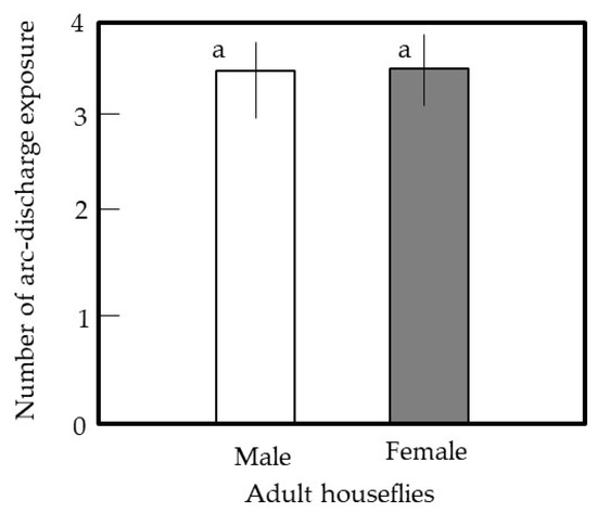 Number of arc-discharge exposures required to kill adult houseflies that climbed up to the arc discharge zapper (ADZ). The flies climbed along the wall of the cell of the grating placed beneath the ADZ and were subjected to the arc discharge when they reached the arcing zone of the device. They were knocked down to the bottom of the cell. The flies attempted several climbing trials and were exposed to repeated arc discharges until they died. Twenty insects were used in each experiment, and the means and standard deviations were calculated from five replicates of the experiments. The letter “a” in each vertical column indicates no significant difference (p < 0.05) according to Tukey’s test.