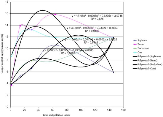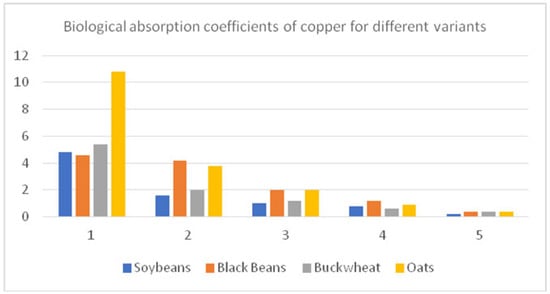 - copper is more actively concentrated in beans, followed by oats. At Zc ≥ 60, the copper concentration in soybean phytomass begins to decrease. In buckwheat phytomass, unlike other crops, copper concentration continues to increase at Zc ≥ 60;