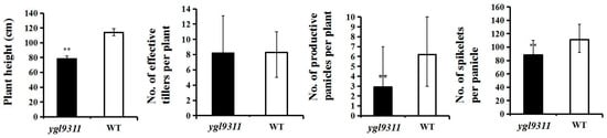 Comparison of major agronomic traits between mutant ygl9311 and the wild-type parent 9311. Bars represent standard deviations of ten independent measurements. Significant differences were determined by Duncan′s Multiple Range test.