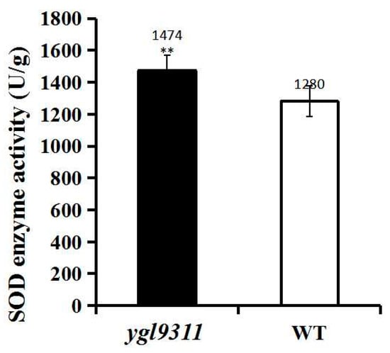 SOD enzyme activity in mutant ygl9311 and the wild-type parent 9311. Bars represent standard deviations of three independent measurements. Significant differences were determined by Duncan′s Multiple Range test.