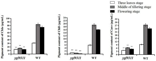 Additionally, the photosynthetic pigment content in the leaves of the mutant ygl9311 and indica cultivar 9311 was measured in this study at the one-core three-leaf stage, middle tillering stage, and heading stage, to investigate the physiological causes of the mutant ygl9311. At the above three stages, the content of Chl a in the mutant was, respectively, 58%, 80%, and 83% lower than that in the indica cultivar 9311, that of Chl b in the mutant was, respectively, 86%, 96%, and 99% lower than that in the indica cultivar 9311, and the carotenoid content in the mutant was, respectively, 58%, 77%, and 79% lower than that in the indica cultivar 9311 (Figure 4). The content of photosynthetic pigments was significantly lower in the mutant than in the indica cultivar 9311 in both the seedling stage and at maturity, consistent with the mutant keeping yellow-green leaves during the whole growth cycle. The above results demonstrate that the change in the leaf color of the mutant is attributed mainly to decreased pigment content in mutant plants.