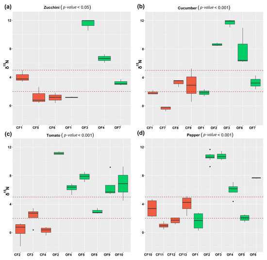 To assess the impact of the different crop managements, namely conventional farming (CF) and organic farming (OF), vegetables from two horticultural crops of Cucurbitaceae (zucchini and cucumber) and Solanaceae (tomato and pepper) were collected from different farmers, some of them providing samples from two or three horticultural cultivars, which revealed useful information to understand the impact of the crop management on the final δ15N values. The use of conventional or organic fertilizers led to clearly different δ15N values in the vegetable samples analysed, as observed in the results from the one-way analysis of variance (ANOVA; Figure 1). Supplementary Tables S1–S4 show the main nitrogen fertilizers used by each farmer and their δ15N values measured. Since the samples in this study were collected from real farmers, it was impossible to calculate the amount applied. Several organic farmers used fertilizers with low δ15N values, but the organic vegetable samples displayed higher δ15N values overall than the conventional ones (as shown in the following sections). This could be partially explained by the fractionation occurring during the slower assimilation of complex chemical-form nitrogen, available in organic fertilizers. Meanwhile, ammonium and nitrates from inorganic fertilizers are rapidly incorporated by the plant, resulting in lower δ15N values. The δ15N values of the soil are also given in this Supplementary Material, with clear differences not being observed between the δ15N values of the soil from the organic and conventional farming systems.