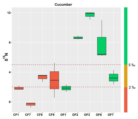 Boxplot of the δ15N values measured in cucumber including three operation ranges. The green range (>5‰) indicates good organic practices, the orange range indicates (values between 2–5‰) organic crops that need to be supervised, and the red range (<2‰) indicates conventional crop systems.
