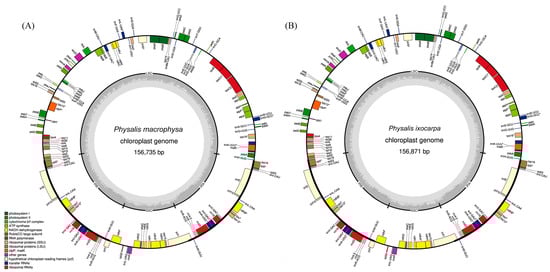 As with most angiosperms, the cp genomes of PMA and PIX consist of a typical quadripartite structure, including a pair of IR regions (IRa and IRb) and one each of an SSC region and a LSC region. In our study, the results indicated that the cp genomes of PMA and PIX both had 132 genes, containing 87 protein-coding genes, eight rRNA genes and 37 tRNA genes. Moreover, the cp genomes of PMA and PIX were similar in length, 156,735 bp and 156,871 bp, respectively, which is consistent with most angiosperms, including other members of the tribe Physaleae. The overall GC contents of PMA (37.53%) and PIX (37.51%) cp genomes were similar to those of the other Physalis species in previous studies [,,]. The results revealed a high level of similarity between PMA and PIX in terms of genome structure, gene content, and gene arrangements, although the cp genomes of the two species showed marked differences from those of PAN, PMI, and PAF in terms of the LSC/IR boundary, from PPH in terms of the SSC/IR boundary, and from PPE and PPR in terms of the contraction of IRs to expand part of rpl2 to LSCs. These results indicated that most of the variations in the cp genome structure in the Physalis genus occurred due to the contraction and expansion of the IR region.