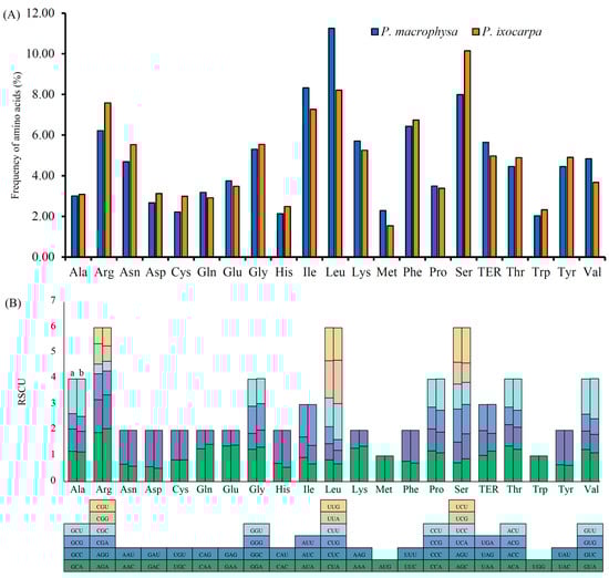 The frequency of amino acids (A) and the number of RSCU of amino acids (B) in the cp genomes of PMA and PIX. (a) PMA, (b) PIX.