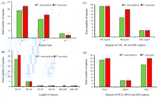 The repeat sequences in cp genomes of PMA and PIX. (A), repeat type; (B), length of repeats; (C), repeats in LSC, SSC and IR regions; (D), repeats in PCG, tRNA and IGS regions.
