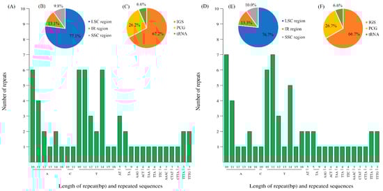 In total, 61 and 60 SSRs were found for PMA and PIX, respectively (Figure 4A–F, Tables S8–S11). The SSRs in PMA comprised 43 mononucleotide repeats, six dinucleotide, five trinucleotide and seven tetranucleotide repeats (Figure 4A). The SSRs in PIX consisted of 42 mononucleotide repeats, six dinucleotide, five trinucleotide, and seven tetranucleotide repeats (Figure 4D). The mononucleotide SSRs contained poly-A, poly-T, and poly-C repeats, of which the A and T bases constituted the majority (67.2% and 68.3% in PMA and PIX, respectively). The SSRs located in the LSC region were the most (77.1% in PMA, 76.7% in PIX), followed by the IR regions (13.1% PMA, 13.3% in PIX), and the SSC region (9.8% and 10.0% in PMA and PIX, respectively) (Figure 4B,E). In addition, the results also showed that most SSRs were found in the intergenic spacer (IGS) regions (67.2% and 66.7% in PMA and PIX, respectively), followed by PCGs (26.2% and 26.7% in PMA and PIX, respectively), and tRNA genes (6.6% and 6.6% in PMA and PIX, respectively) (Figure 4C,F).