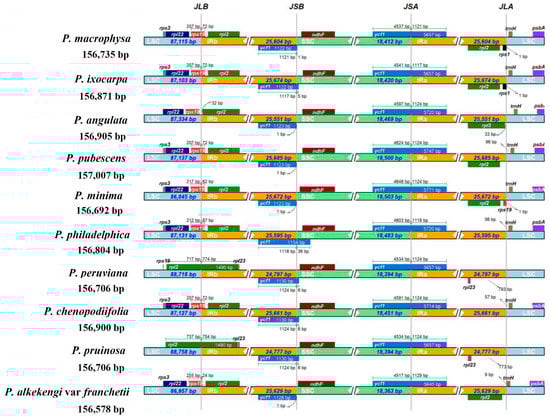Comparison of the borders of the IR, SSC and LSC regions among the 10 Physalis cp genomes.