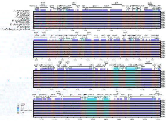 Eight reported Physalis cp genome sequences, namely PAN (GenBank accession number MH045574), PPU (MH045576), PMI (MH045577), PPH (MN192191), PPE (MH019242), PCH (MN508249), PPR (MH019243), and PAF (MH045575), were downloaded from the NCBI database. The homology and collinearity analysis were conducted using Mauve software (http://gel.ahabs.wisc.edu/mauve; accessed on 25 July 2022) [], and the homologous sequences were compared using MAFFT software (https://mafft.cbrc.jp/alignment/software/; accessed on 25 July 2022) []. DnaSP 6.0 (http://www.ub.edu/dnasp/; accessed on 30 July 2022) was used to calculate the Pi (nucleotide variability) value of each gene []. The boundary information of LSC/IRs and SSC/IRs regions was visualized by using IRscope software (https://github.com/Limpfrog/irscope; accessed on 30 July 2022) []. The genomic variation among Physalis species was compared using mVISTA in the global alignment Shuffle-LAGAN mode (https://genome.lbl.gov/vista/mvista/about.shtml; accessed on 25 July 2022) [].