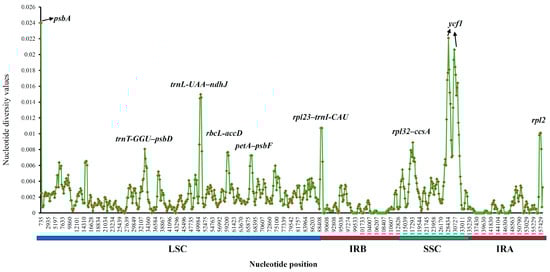 To further clarify the level of sequence divergence and to identify the divergent hotspots, the nucleotide diversity (Pi) values within 800 bp in the 10 Physalis cp genomes were calculated with DnaSP 6.0 software (http://www.ub.edu/dnasp/; accessed on 30 July 2022). Among the 10 Physalis species, these Pi values varied from 0 to 0.024 with a mean of 0.00235 (Figure 7 and Table S12). Nine highly divergent regions were detected, namely psbA, trnT-GGU–psbD, trnL-UAA–ndhJ, rbcL–accD, petA–psbF, rpl23–trnI-CAU, rpl32–ccsA, ycf1, and rpl2, with the nucleotide diversity (Pi) values ranging from 0.00725 (petA–psbF) to 0.024 (psbA) (Figure 7 and Table S13). Six of these divergent regions (psbA, trnT-GGU–psbD, trnL-UAA–ndhJ, rbcL–accD, petA–psbF and rpl23–trnI-CAU) were located in the LSC region, two (rpl32–ccsA and ycf1) were located in the SSC region, and one (rpl2) in the IRa region.