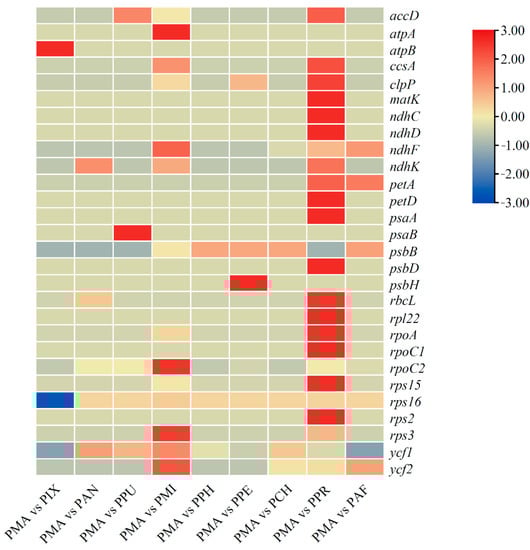 Synonymous codon usage bias is important in shaping gene expression and cellular function []. RSCU is the result of the natural selection, genetic drift, and mutation [,,]. In the present study, we found that methionine was the least represented amino acid in the gene products of the cp genomes of both PMA and PIX, a finding similar to the results from PAN, PPU, PMI, and PAF []. More interestingly, we found that the most abundant amino acids in the gene products of the cp genomes of PMA and PIX were leucine and serine, respectively. In addition, a preference for codons ending with A/U was observed in the cp genomes of both species, a finding which is consistent with that from the Fabaceae family members Trifolium spp. [] and Medicago sativa [], but different from the results obtained from Apocynum pictum [] and Leptodermis scabrida [].
