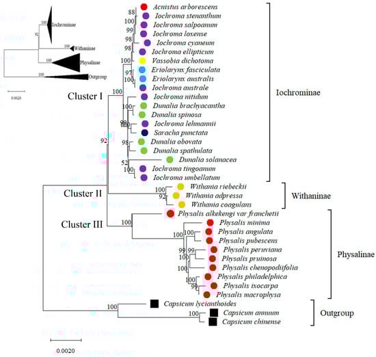 Phylogenetic tree analysis showed that all species formed three major clusters, which corresponded to the three subtribes (Figure 9). In the ML tree, cluster I comprised 20 species of six genera from subtribe Iochrominae, including 10 Iochroma species, five Dunalia species, two Eriolarynx species, and one each from the genera Acnistus, Saracha, and Vassobia. The 10 test Physalis species belonging to the subtribe Physalinae, namely PMA, PIX, PAN, PPU, PMI, PPH, PPE, PCH, PPR, and PAF, were grouped into cluster II. Cluster III included three Withania species (Withania coagulans, Withania adpressa and Withania riebeckii) from the subtribe Withaninae. In addition, the results showed that PMA, PIX, and PPH were closely related to one another, while PAF was distantly related to other Physalis species.