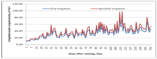 Daily irrigation water requirements for the wheat plant under drip and sprinkler irrigation systems.