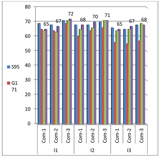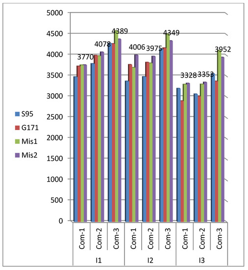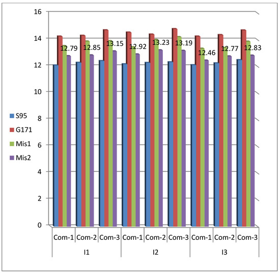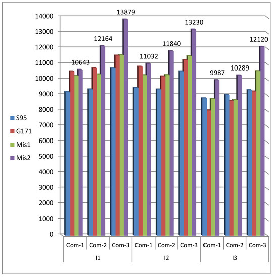 Results recorded in Table 4, Table 5, Table 6, Table 7 and Table 8 observed that the application of Com3 × Mis1 or Com3 × Mis2 under the effect of either I1, I2, or I3 led to a significant increase for all the yield and yield components under study during both seasons. These results are in agreement with those stated by Bayoumy et al. [38].