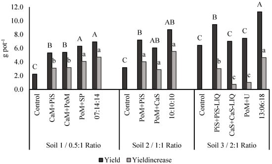 Total yield (DM) and yield increase (Yieldincrease). Within each ratio, different letters represent significant differences for p < 0.05 (Tukey test), with capital letters referring to yield and small letters referring to yield increase. PiS: pig slurry; PiS-LIQ: liquid fraction from pig slurry; CaS: cattle slurry; CaS-LIQ: liquid fraction from cattle slurry; CaM: cattle manure; PoM: poultry manure; PoM+U: poultry manure with urea; PoM+SP: poultry manure with superphosphate; +: mixed with.