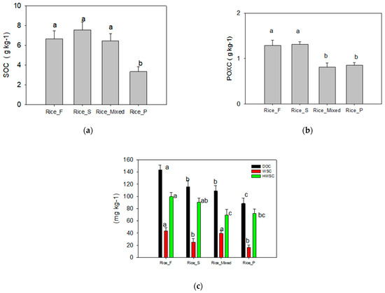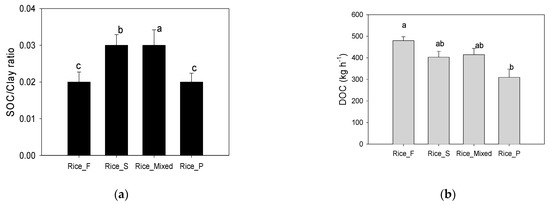In this study, we wanted to explain the differences in the input residues based on the RRCS; that is, the differences in terms of the physical nature (structural differences and the solubility of plant organs) and the effectiveness of SOM formation [49]. The rate of input and the quality of crop residue, such as rice straw, led to the highest SOC and DOC in Rice_F and Rice_S and the lowest SOC and DOC in Rice_P.