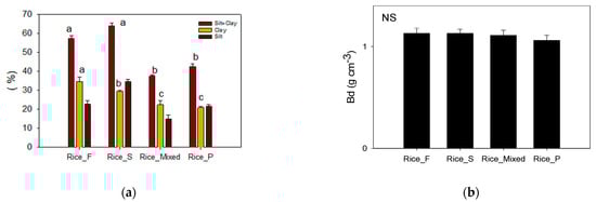 Physical properties of the RRCSs: Particle distribution in terms of clay, silt, and sand (a); bulk density of soil (b). Note: The bars with the standard error of the mean and labeled with different lowercase letters indicate a difference between rice rotation patterns (p < 0.05). In the rice cultivation system, different crops are used each year. Rice_ F = rice followed by a fallow period, i.e., no plantation; Rice_S = rice followed by shallots; Rice_Mixed = rice followed by tobacco, maize, and vegetables; and Rice_P = rice followed by potato.