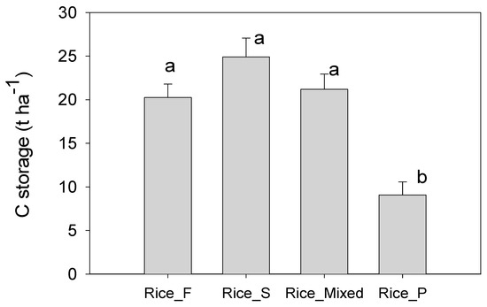 Compared to other patterns, Rice_S (24.904 t ha−1) led to the highest carbon storage, confirming that the amount of SOC was the highest in Rice_S. Meanwhile, Rice_P showed the lowest carbon storage (9.067 t ha−1) and the carbon amounts stored in Rice_F and Rice_Mixed were 20.253 and 21.194 t ha−1, respectively (p < 0.05; Figure 7).