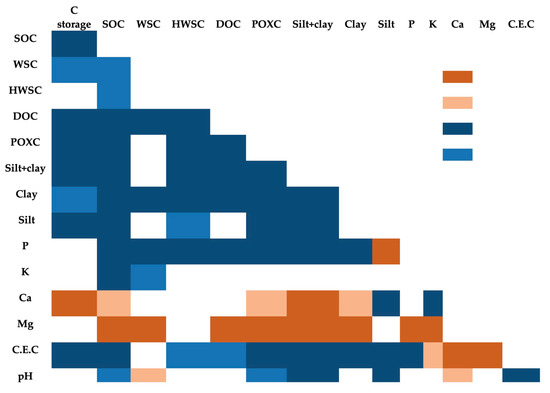 The correlation coefficient between carbon storage and SOC and other soil parameters under the RRCS. Note: Dark blue means a highly positive relation (p ≤ 0.01–0.00), light blue means a low positive relationship (p ≤ 0.01–0.04), dark brown means a high negative relationship (p ≤ 0.01–0.00), light brown means a low negative relation (p ≤ 0.01–0.04), and blank means no significant relationship.