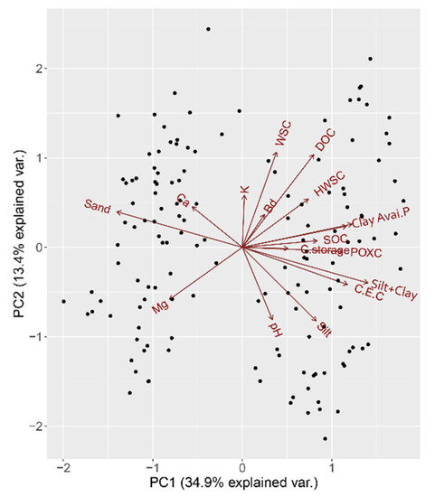 The results of the PCA showed that in all the RRCSs, clay, clay + silt, CEC, Avail P, DOC, pH, Bd, affected soil carbon, and SOC were influenced by one another. A variance of 34.90% was the main driving factor behind carbon storage and SOC in the arable soil when paddy was rotated with another plant of the tropical humid zone. Meanwhile, Ca2+ and Mg2+ would be the minor driving factor, explained by a variance of 13.40% (Figure 9).