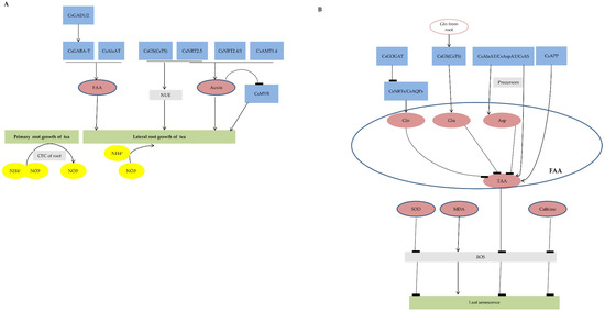 Nitrogen efficiency of plants can be divided into two components: uptake efficiency and utilization efficiency [80]. Compared with the primary root, lateral roots have a greater surface area; their growth markedly increases the extent of the root system and enables the plant to absorb many more nutrients from soils [81,82,83]. Wu’s group recently compared root growth and gene expression in two contrasting tea genotypes: Longjing43 (LJ-43, low-N tolerant) and Liyou002 (LY-002, high-N tolerant). They assessed plant growth phenotypes as well as free amino acids and N contents of the soil. Low-N tolerant LJ-43 produced more lateral roots than LY-002, suggesting that an enhanced capacity for lateral root production may support greater N capture in this genotype [84]. The expression of several genes involved in N transport and assimilation (such as CsNRT2.5 and CsGS2) was upregulated in roots of LJ-43 sampled far from the site of fertilization, supporting the higher N transport ability and NUE of this genotype [84]. CsAsPAT1, CsAsPAT3, CsAMT1-1, CsNR, CsGs(CsTS)1, and CsPDC2 were upregulated in both LJ-43 and LY-002 in response to fertilization, and this upregulation was greater in LY-002 than in LJ-43. By contrast, CsNRT1.7, CsGAD1, and CsGAD2 were downregulated in LJ-43 but upregulated in LY-002, suggesting increased activity of glutamate decarboxylase in LY-002 but reduced activity in LJ-43 [84]. CsGABA-T, CsNRT2.5, CsGS2, and CsAlaAT were upregulated in LJ-43 but downregulated in LY-002 [84]. The glutamate decarboxylate CsGAD1 and CsGAD2 catalyze a crucial step in γ-aminobutyric acid (GABA) biosynthesis [85,86,87]. The subsequent conversion of GABA to alanine is catalyzed by γ-aminobutyric acid transaminase (GABA-T) [88], and a GABA-T knockdown mutant showed substantial GABA accumulation [89]. Alanine aminotransferase (AlaAT) transfers an amino group from alanine to 2-oxoglutarate, producing glutamic acid and pyruvate [90]. Both CsGABA-T and CsAlaAT were upregulated in LJ-43 whereas repressed in LY-002, suggesting that transformations of GABA to alanine and alanine to glutamic acid were promoted in LJ-43 but supressed in LY-002. There was greater GABA and alanine accumulation in LY-002 than in LJ-43, whereas glutamic acid and theanine levels were higher in LJ-43 than in LY-002 under low-N conditions. Overall, genotype differences in free amino acid transformations appeared to reflect differential regulation of CsGAD1, CsGAD2, CsGABA-T, and CsAlaAT [84] (Figure 2A).