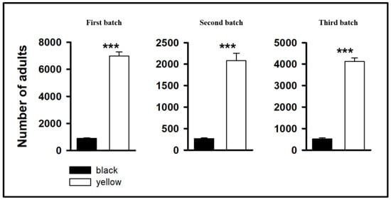 The numbers of yellow and black H. axyridis among a natural overwinter population collected in late September from Mao’er Mountain (Heilongjiang, China) were collected from 2013 to 2021. As shown in Figure 1, yellow adults were dominant in all three batches, with a proportion of 88.68%, 88.75%, and 88.85%.