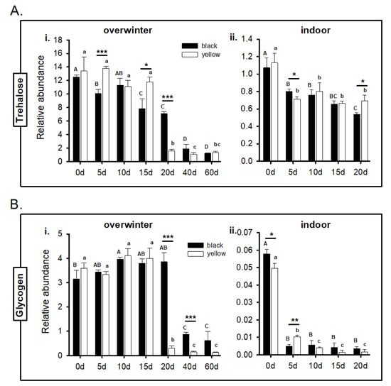 Changes in the contents of (A) trehalose and (B) glycogen in yellow (non-melanic) and black (melanic) H. axyridis adults of overwinter (i) and experimental (indoor) (ii) populations during cold storage (0–60 days and 0–20 days, respectively). Bars represent the mean (+SD) of three replicate experiments. The content of trehalose or glycogen at 0 d cold storage was used as the control group. Bars with different letters indicate significant differences (one-way ANOVA, p ≤ 0.05). Asterisks indicate significant differences between yellow and black adults in the same storage period (t-test, *** p ≤ 0.001; ** p ≤ 0.01; * p ≤ 0.05).