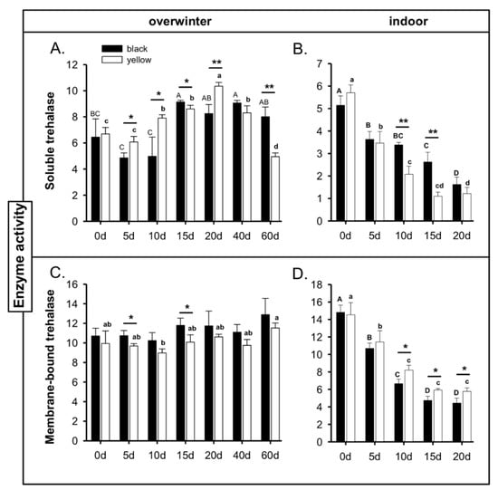 Changes in two trehalase enzymes in H. axyridis yellow (non-melanic) and black (melanic) adults in the overwinter and experimental (indoor) populations under different cold storage periods (0–60 days and 0–20 days, respectively). (A,B) Changes of TRE1 during cold storage in overwinter and experimental (indoor) H. axyridis populations. (C,D) Changes of TRE2 during cold storage in overwinter and experimental (indoor) H. axyridis populations. Bars represent the mean (+SD) of three replicate experiments. The trehalase activity at 0 d cold storage was used as the control group. Bars with different letters indicate significant differences (one-way ANOVA, p ≤ 0.05). Asterisks indicate significant differences between yellow and black adults in the same storage period (t-test, ** p ≤ 0.01; * p ≤ 0.05).