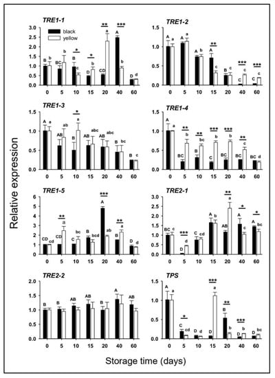Changes in mRNA expression levels of seven trehalase genes and one TPS gene in H. axyridis yellow (non-melanic) and black (melanic) adults of the overwinter population during cold storage (0–60 days). The relative expression levels of the target genes were calculated using the Harp49 (H. axyridis ribosomal protein 49 gene) expression level with RT-qPCR. Bars represent the mean (+SD) of three replicates. The expression level of each gene at 0 d of cold storage was used as the control group. Bars with different letters indicate significant differences (one-way ANOVA, p ≤ 0.05). Asterisks indicate significant differences between yellow and black adults in the same storage period (t-test, *** p ≤ 0.001; ** p ≤ 0.01; * p ≤ 0.05).