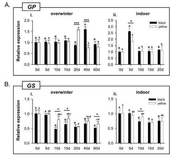 Changes in mRNA expression levels of GP (A) and GS (B) genes in H. axyridis yellow (non-melanic) and black (melanic) adults of the overwinter and experimental (indoor laboratory) populations under different cold storage periods (0–60 days and 0–20 days, respectively). The relative levels of the target genes were calculated based on the expression level of Harp49 (H. axyridis ribosomal protein 49 gene) with RT-qPCR. Bars represent the mean (+SD) of three replicates. The expression level of each gene at 0 d of cold storage was used as the control group. Bars with different letters indicate significant differences (one-way ANOVA, p < 0.05). Asterisks indicate significant differences between yellow and black adults in the same storage period (t-test, *** p ≤ 0.001; * p ≤ 0.05).