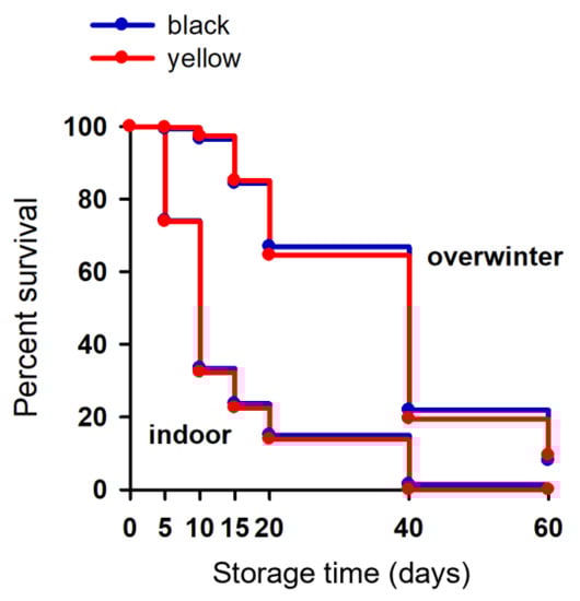 Representative survival curves of overwinter and experimental (indoor) black and yellow adults after low-temperature storage for 60 days; n = 180–235 adult beetles. Data are representative of three independent experiments.