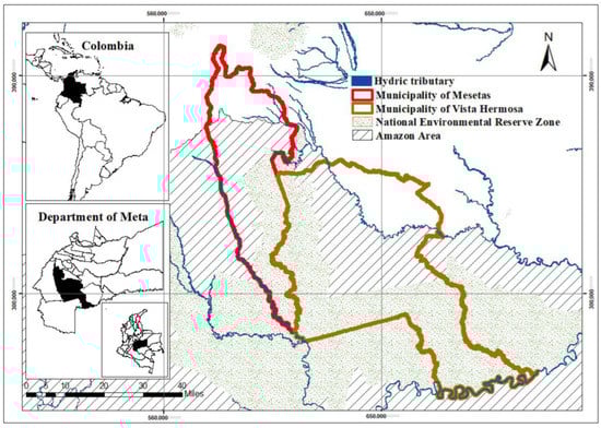 The study was conducted in rural areas of the municipalities of Mesetas and Vista Hermosa, located in the department of Meta, southern Colombia. These municipalities are part of the Ariari sub-region, where cocoa production in the department is located (Figure 1). Eighty-three plots were randomly selected under agroforestry arrangements with cocoa from 22 farms belonging to the Association of Cocoa Growers of the Department of Meta CACAOMET. On each farm, cocoa lots in production with an area greater than 1.5 ha were identified, where the sampling plot was established with an area of 1000 m2 (50 m × 20 m) in the central part of each lot. A total of 13 cocoa clones were located, among which were the universal ones such as CCN-51 (Collection Castro Naranjal), ICS-51, ICS-95 (Imperial College Selection), TSH-565 (Trinidad Selection Hybrid) and regional ones described by Perea et al. [] as FEAR-5 (Fedecacao Arauquita Arauca, Trinidadian Hybrid), FSA-11, FSA-12, FSA-13 (Fedecacao Saravena Arauca, Trinidadian Hybrid), FTA-2 (Fedecacao Tame Arauca, Trinidadian Hybrid). As well, MON-1 (regional hybrid) and hybrids with different pod coloration at maturity (yellow, red and green) were located. For the present study, clones CCN-51, ICS-95, TSH-565, FEAR-5, FSA-11, FSA-12 were selected, since they were the most frequent in the field; the other clones were excluded due to the low availability of replicates.