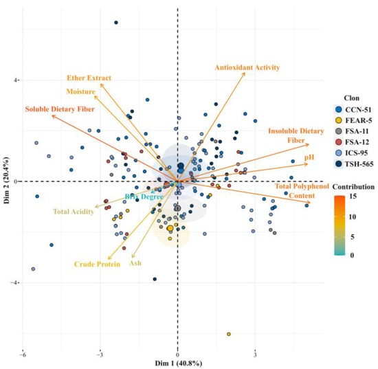 Principal component analysis for the physicochemical variables in relation to the clones evaluated in the department of Meta (Colombia). The color of each variable shows the level of contribution in each component, where green and red are higher to lower contribution.