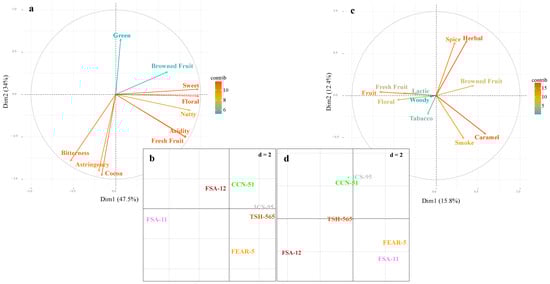 Principal component analysis of the matrix of sensory profile and cocoa notes according to cocoa clones from the department of Meta, Colombia. (a) organoleptic qualities, (b) distribution of cocoa clones in relation to organoleptic qualities, (c) sensory notes, (d) distribution of cocoa clones in relation to sensory notes. The color of each variable shows the level of contribution in each component, where green and red is higher to lower contribution.