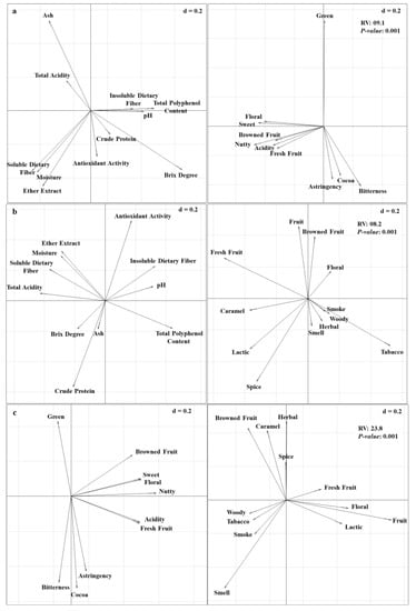 Figure 4 shows the results of the co-inertia analysis between the matrix of physicochemical variables and sensory attributes (organoleptic qualities and sensory notes), where there is a significant relationship between these matrices. For example, physicochemical variables and organoleptic qualities had a relationship of 9.1% (p < 0.001), and between physicochemical variables and sensory notes, there was a relationship of 8.2% (p < 0.001). However, these two matrices (organoleptic qualities and sensory notes) presented a greater co-interference reaching 23.8% (p < 0.001). When analyzing the relationship between the variables of each of the matrices, for example, a relationship was found between antioxidant activity and astringency, as well as brix and bitterness (Figure 4a). As for the relationship between the physicochemical variables and the notes, it was found that the total polyphenol content was related to tobacco notes and the crude protein content to the spicy notes (Figure 4b).