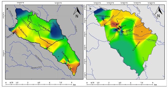 Map of the sensory distribution of cocoa in the municipalities of Mesetas (a) and Vista Hermosa (b). Blue to red indicates highest to lowest cocoa bean quality.