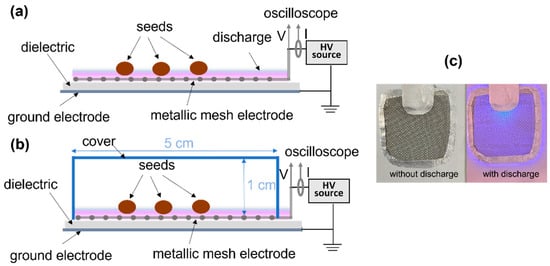 Schematic representation of the flexible configuration used for the seed treatments: (a) direct plasma, (b) with cover, (c) picture of the electrode from above without and with discharge.