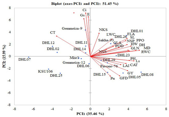 Kaiser–Meyer–Olkin measure of sampling adequacy showed a high value (KMO > 0.5). Based on the absolute value of each eigenvector, the PCA grouped the estimated variables (25 indices) into seven principal comprehensive indices (eigenvalue > 1), which had contribution rates of 35.47% (PCI1), 15.99% (PCI2), 10.88% (PCI3), 7.89% (PCI4), 5.20% (PCI5), 4.38% (PCI6), and 4.28% (PCI7). The cumulative contribution rate reached 84.09% (Table 3). PCI1 was related to DH, MD, GFD, NS, PH, GLN, LAF, LAI, SL, RWC, HW CT, Ls, PPO, CAT, and GY. PCI2 was related to Gs, Ci, and E. PCI3 was related to NSS and Pn; PCI4 was related to LWC and NKS; PCI5 and PCI6 were related to GLA and POD, respectively (Table 2). Figure 1 shows the correlations between variables (RWC and Ci) with factors (PCA1 and PCA2) were the highest value for squared cosines (0.885 and 0.759), respectively. So, the vectors were for RWC and Ci longer and acute with factors. As shown in Table 3, the seven principal comprehensive indices (PCI) were calculated for each genotype.
