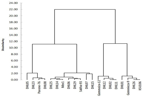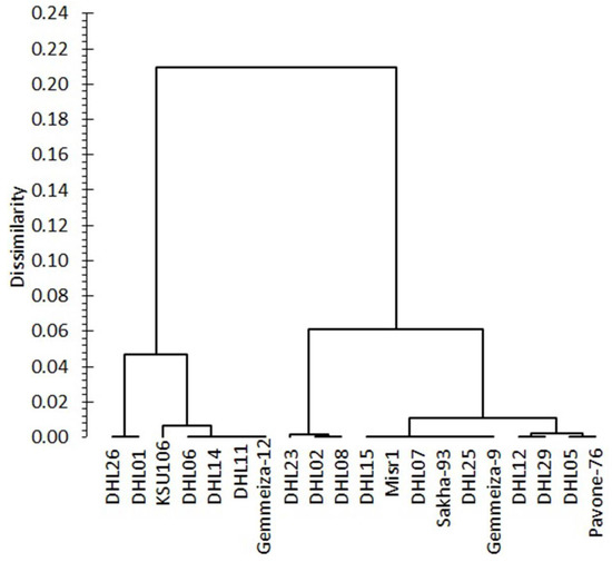 Cluster I was classified as highly tolerant (HT, with the highest value of D ≥ 0.638), consisting of three genotypes (DHL02, DHL23, DHL08); cluster II was classified as tolerant (T, with values of 0.638 > D ≥ 0.503), consisting of four genotypes (DHL12, DHL29, DHL05, and Pavone-76), Cluster III was classified as moderately tolerant (I, with values of 0.503 > D ≥ 0.458), consisting of six genotypes (DHL25, DHL07, Gemmeiza-9, DHL15, Misr1, and Sakha-93), Cluster IV was classified as sensitive (S, with values of 0.458 > D ≥ 0.293), consisting of five genotypes (DHL11, KSU106, Gemmeiza-12, DHL14, and DHL06). The genotypes DHL26 and DHL01 had lower D values (D < 0.293) and were placed into Cluster VI and designated as a highly sensitive (HS) group (Figure 2).