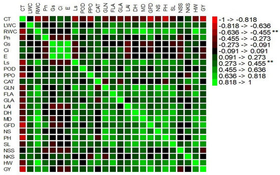 All 20 wheat genotypes were assessed using 25 physio-morphological and agronomic attributes. The mean value of five samples and/or plants per genotype for measuring all physio-morphological and some agronomic attributes were randomly selected from middle rows to reduce environmental impact and repeated three times. Twelve physiological crop attributes were estimated at the grain-filling stage. These include canopy temperature (CT), leaf water content (LWC), relative water content (RWC), photosynthesis rate (Pn), transpiration rate (E), stomatal conductance (Gs), intracellular CO2 concentration (Ci), stomatal limitation value (Ls), peroxidase (POD), polyphenol oxidase (PPO), and catalase (CAT). Briefly, CT was measured using an infrared thermometer (Therma CAM SC 3000 infrared camera, FLIR System, USA). LWC and RWC were obtained by fresh weight (FW), turgid weight (TW), and dry weight (DW) after oven drying at 48 h at 70 °C [37,38] deceptively. Pn, E, Gs, and Ci were measured on the upper third of flag leaves by a Li-6400 gas exchange system (Li-Cor, Inc., Lincoln, NE, USA) from 10:00 AM until 12 noon.