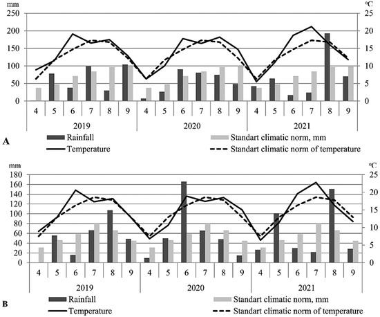 The meteorological conditions of the experimental sites from 2019 to 2021 (data from the Vėžaičiai and Dotnuva, Automatical Meteorological Station). (A) The western region of Lithuania and (B) the central region of Lithuania.