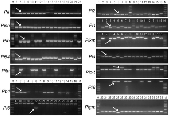 For molecular screening, the rice varieties were genotyped for the presence of 14 major blast resistance genes Pit, Pish, Pib, Pi1, Pia, Pi54, Pita, Pi9, Pi2, Pikm, Pigm, Pi5, Pb1, and Piz-t. A total of 14 molecular markers were selected from published primer sequences and used for molecular screening. The details of information of the primer pairs were provided in Table S1 [37,38,39,40,41,42,43,44,45,46,47,48].