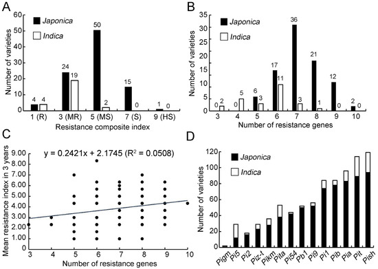 The number of R genes detected in the rice main varieties was normally distributed. The frequency of the positive allele of R gene ranges from three genes (2 rice varieties) to ten genes (2 rice varieties) in the 119 varieties, mostly ranging from 6–9 genes in japonica rice and 4 or 6 genes in indica rice (Figure 2B). In addition, correlation analysis showed that the resistance level was weakly positively correlated with the number of resistance genes (R2 = 0.0508, p < 0.05) (Figure 2C).