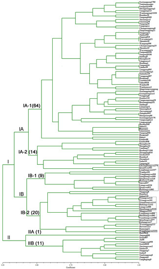 The present study categorized 119 rice main varieties into two groups at 60% level of genetic similarity and further subdivided them into six sub-clusters: IA-1, IA-2, IB-1, IB-2, IIA, and IIB. Sub-cluster IB contained 21 (84%) indica rice varieties, which were grown in northern Jiangsu. By comparison, the other four sub-clusters consisted of almost all japonica rice varieties, which were grown in various rice-growing regions in Jiangsu province. These results showed that the genetically similar genotypes of each cluster were differentiated by rice varieties in different ecologies.